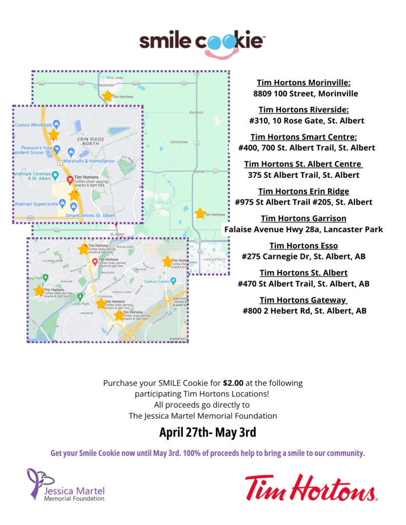 Smile Cookies are available at participating Tim Hortons locations in St. Albert, Morinville, and the surrounding area.